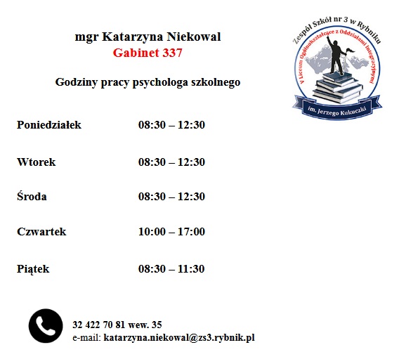 PRZED WIZYTĄ RODZICÓW/OPIEKUNÓW PRAWNYCH U PSYCHOLOGA SZKOLNEGO PROSIMY O WCZEŚNIEJSZY KONTAKT TELEFONICZNY W CELU UZGODNIENIA TERMINU SPOTKANIA.